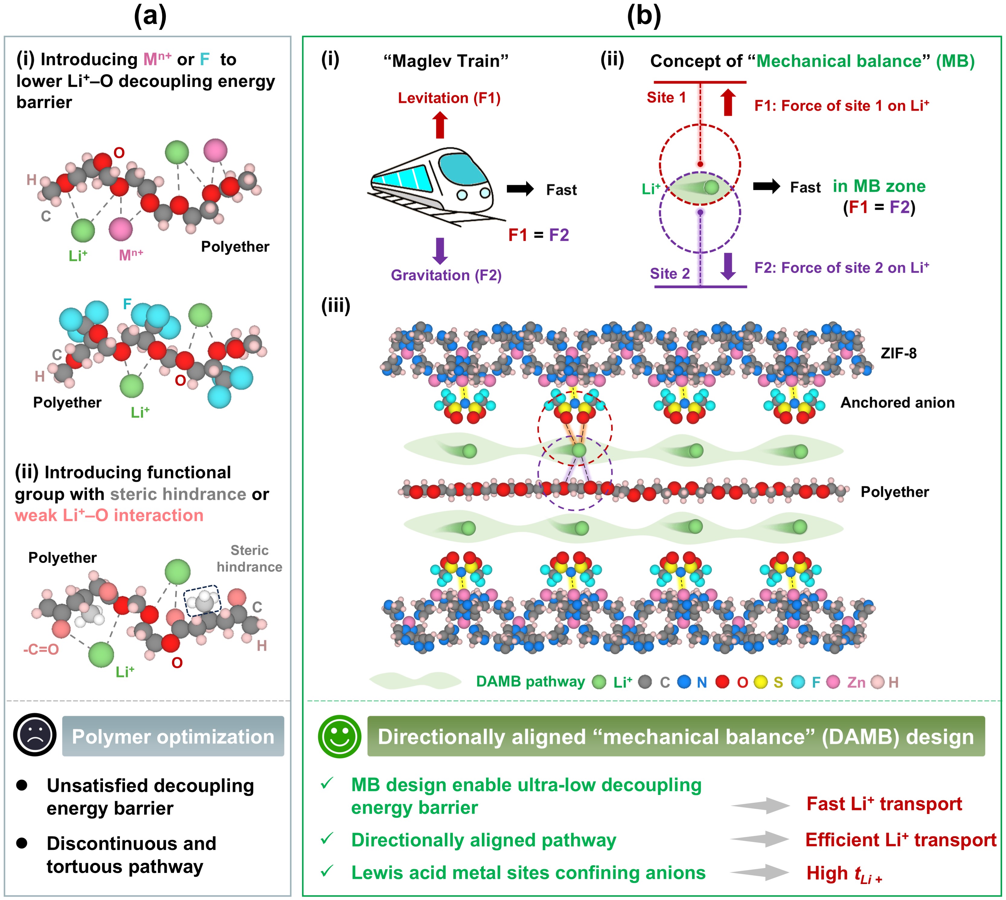 固态聚合物电解质(SPEs)因具备柔韧性、易加工性及良好电极界面兼容性而备受关注。然而传统SPE中强Li+−聚合物相互作用和曲折的离子传输途径,使其离子电导率本质上较低,成为制约电池性能提升的关键瓶颈。因此,为了解决这一基本挑战涉及双重优化:通过精心设计的Li+−聚合物相互作用来提高Li+迁移动力学,同时尽量缩短传输距离以提高传输效率。这对于开发高离子电导率的SPE至关重要。